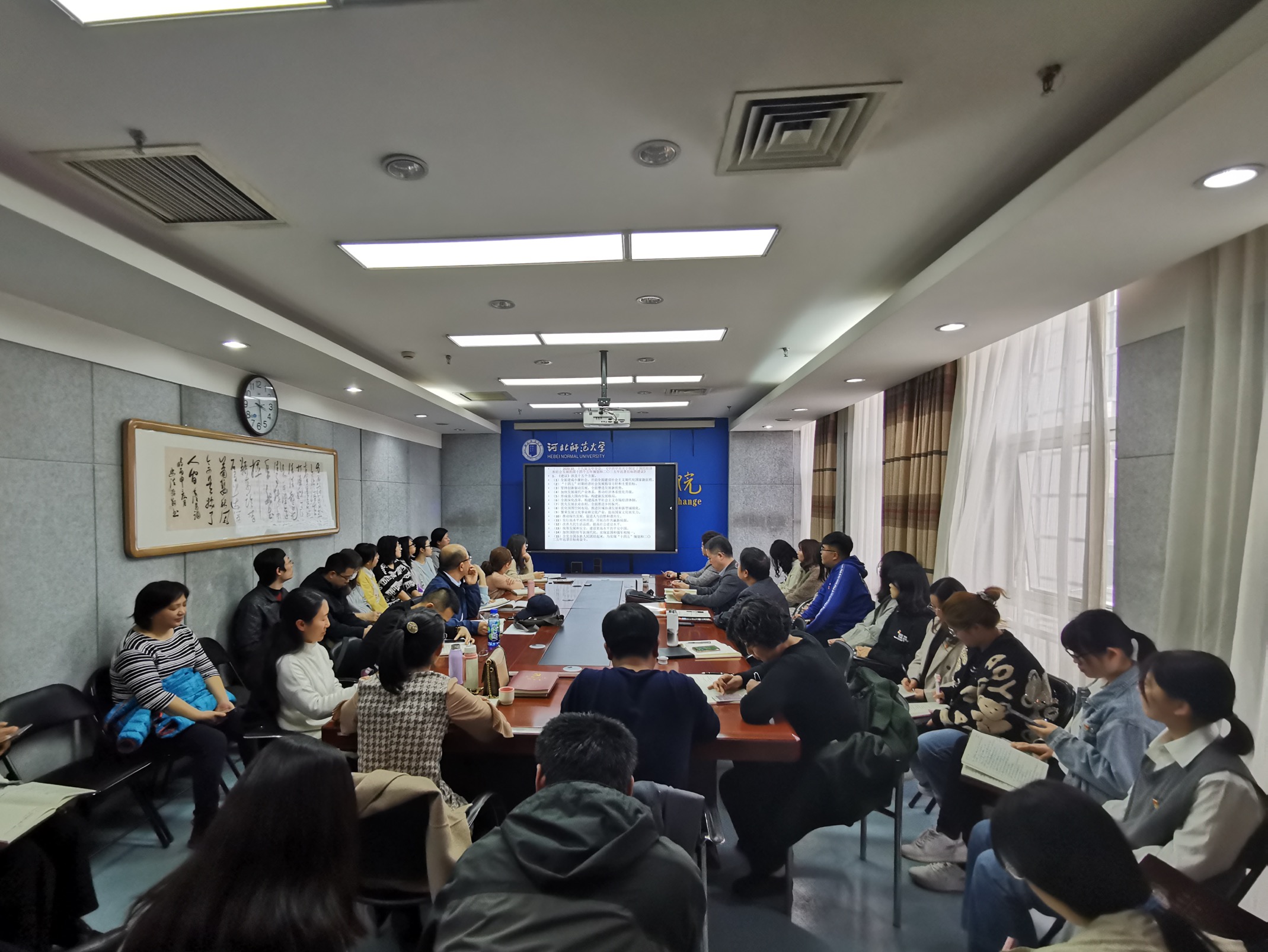 徐教授以重大历史事件为脉络,从“新民主主义革命时期完成救国大业”、“社会主义革命建设时期完成兴国大业”、“改革开放和社会主义现代化建设推进复国大业”、“中国特色社会主义新时代推进强国大业”四个方面,带领大家一起重温了中国共产党自诞生以来艰苦卓绝的伟大奋斗历程,并以“中国共产党百年历史经验总结”为题总结了党在百年奋斗历史中积累的十三条宝贵经验,生动阐述了中国共产党人“守初心,担使命”“为人民谋幸福、为民族谋复兴”的光辉历程。徐教授结合个人体会指出:中国共产党建党百年来,已团结带领中国人民创造了辉煌的历史。中国共产党至今已取得的成绩,为今后再创辉煌提供了前提、奠定了基础。